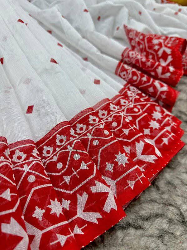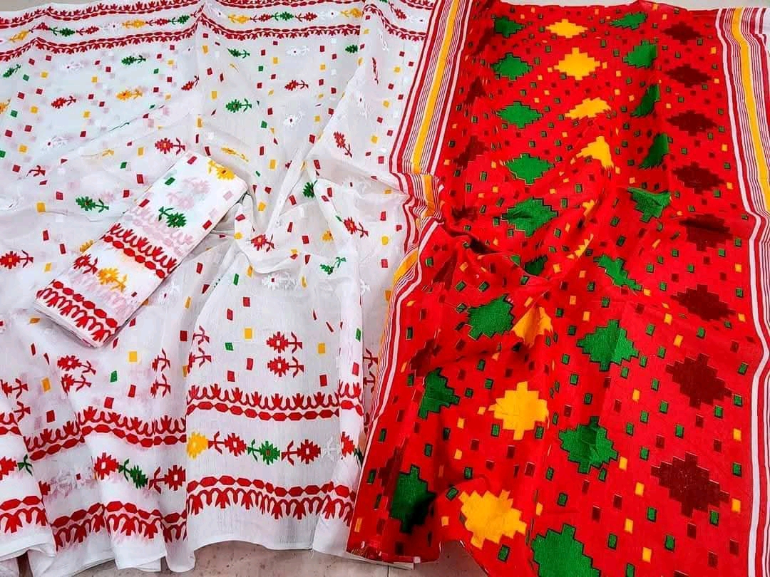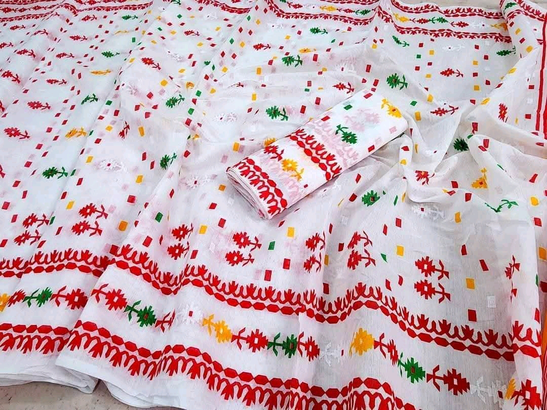✔️ পুরো শাড়িতে সূক্ষ্ম ও আকর্ষণীয় জামদানি প্রিন্ট ডিজাইন